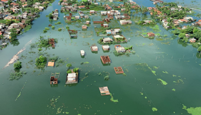 In Zakiganj, Bangladesh, people were seen fishing on submerged roads and some residents took their cattle to flood shelters.